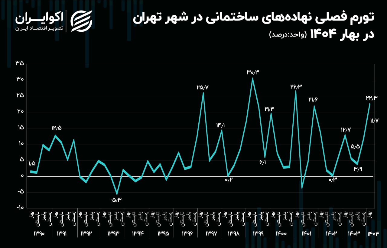 تورم فصلی نهاده‌های ساختمانی تهران در بهار 1404 به 22.3 درصد رسید و نسبت به فصل قبل 11.7 واحد درصد افزایش پیدا کرد. تورم نقطه‌ای بهار امسال هم نسبت به بهار پارسال افزایش 49.7 درصدی داشته که بیشترین تورم نقطه به نقطه در سه سال اخیر محسوب می‌شود. به عبارت دیگر، مصالح ساختمانی در شهر تهران طی بهار سال جاری تقریبا 50 درصد نسبت به همین مدت در سال قبل افزایش قیمت داشته است. این شاخص نسبت به سطحی که در زمستان سال قبل داشت هم افزایش 11.8 واحد درصدی را تجربه کرده است. تمام این شاخص‌ها، تورم فزاینده نهاده‌های ساختمانی در تهران را نشان می‌دهد که می‌تواند رکود تورمی مسکن را از قبل هم عمیق‌تر ‌کند.